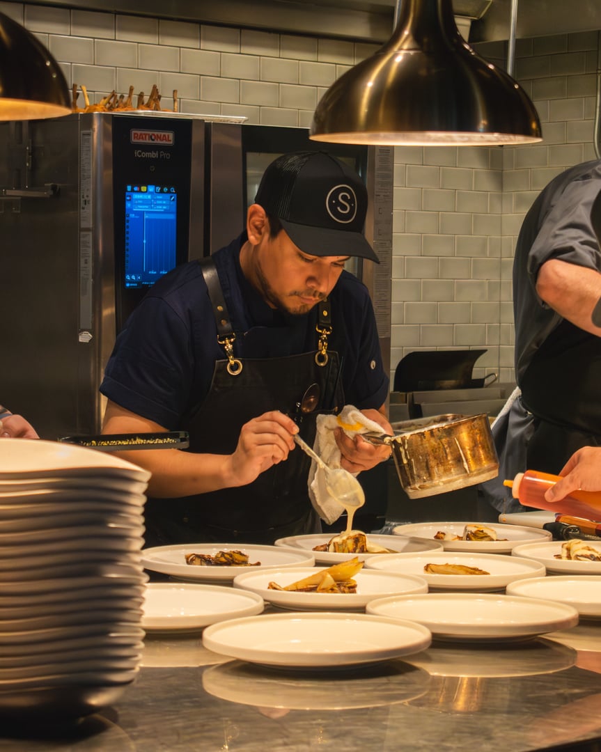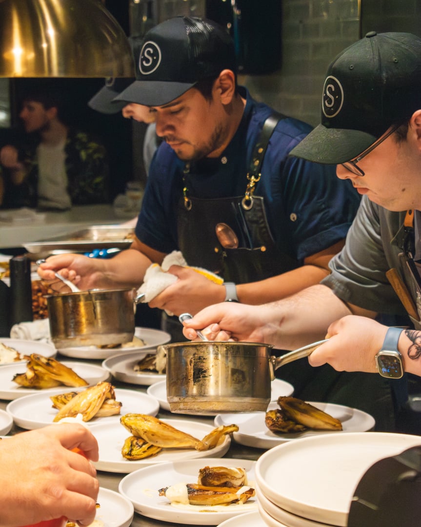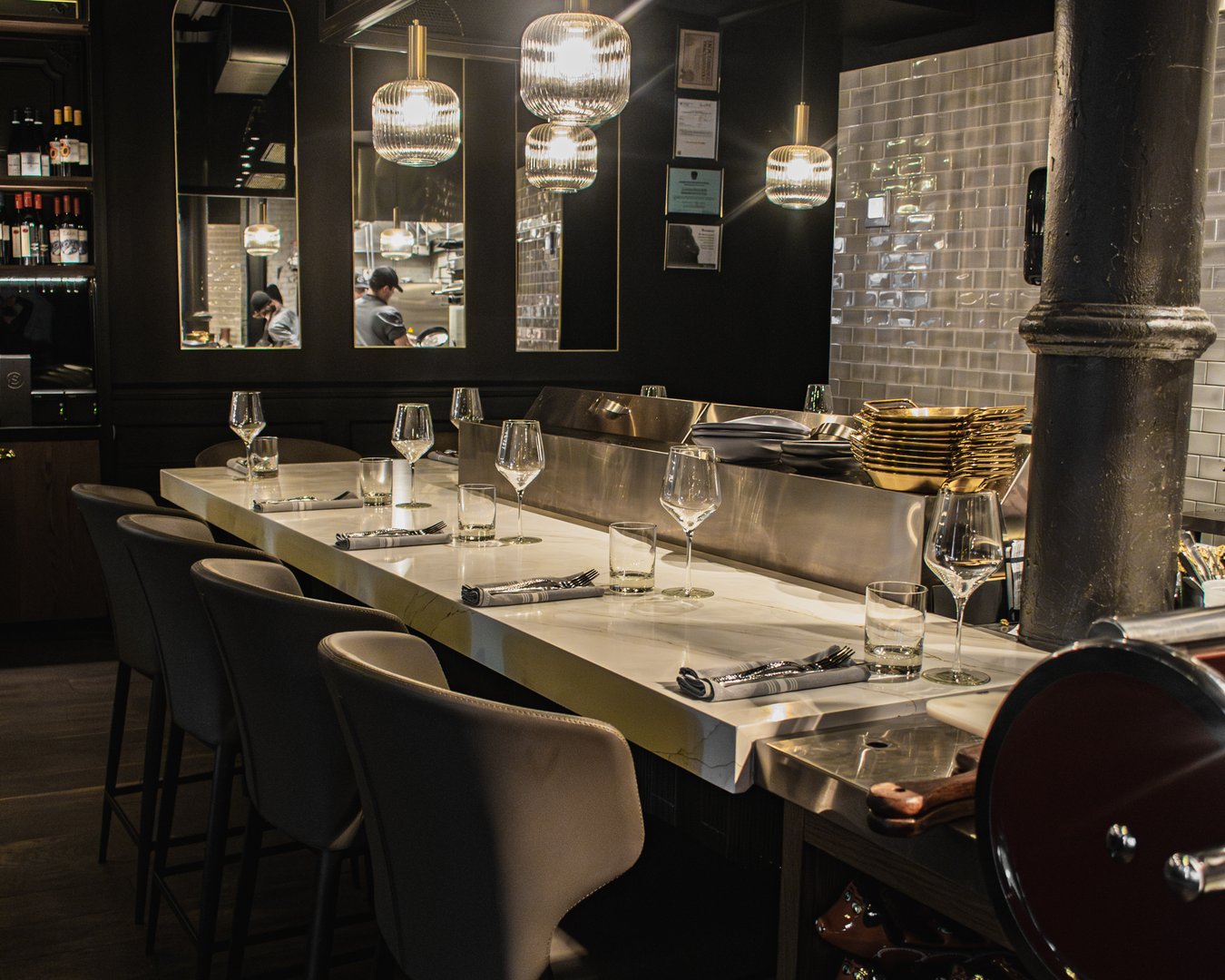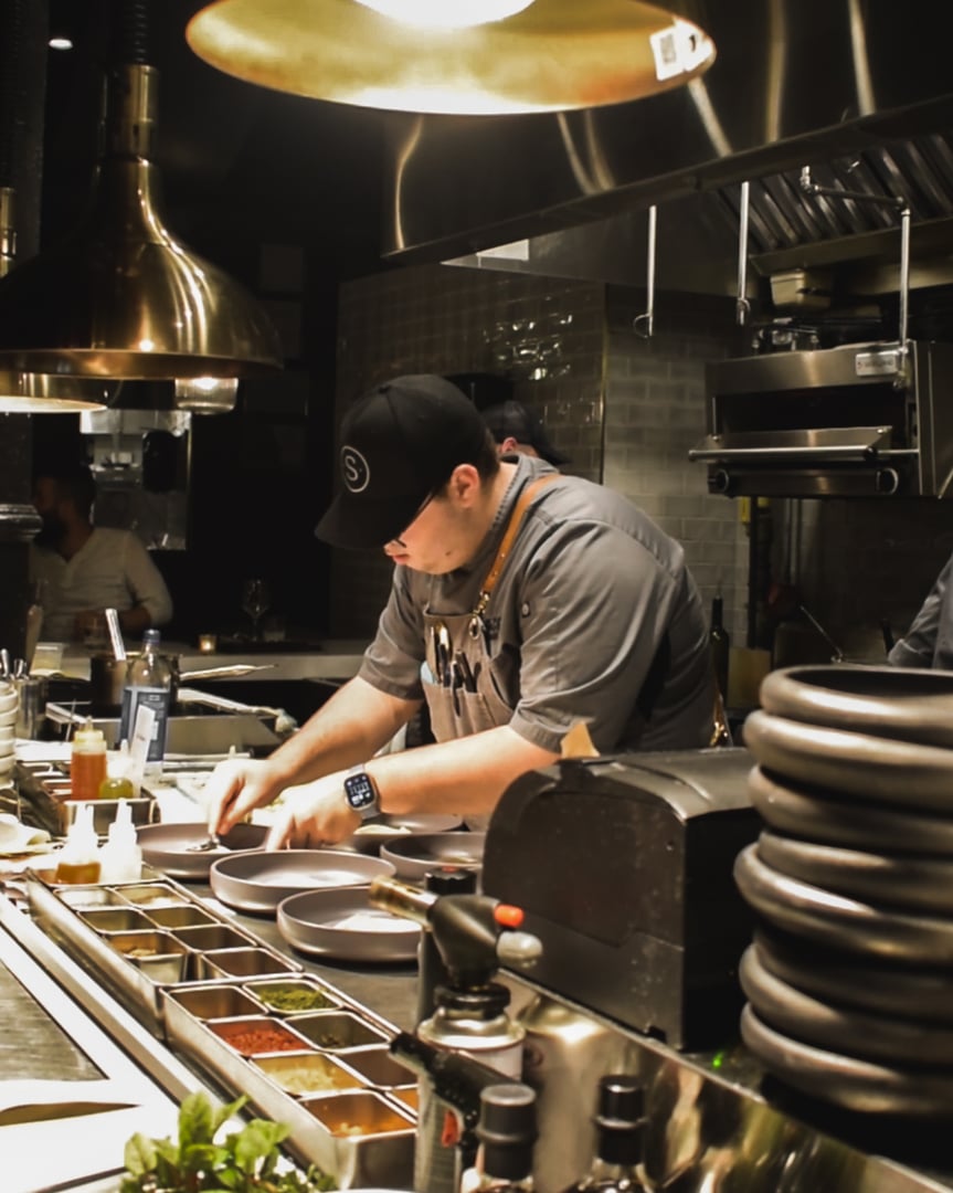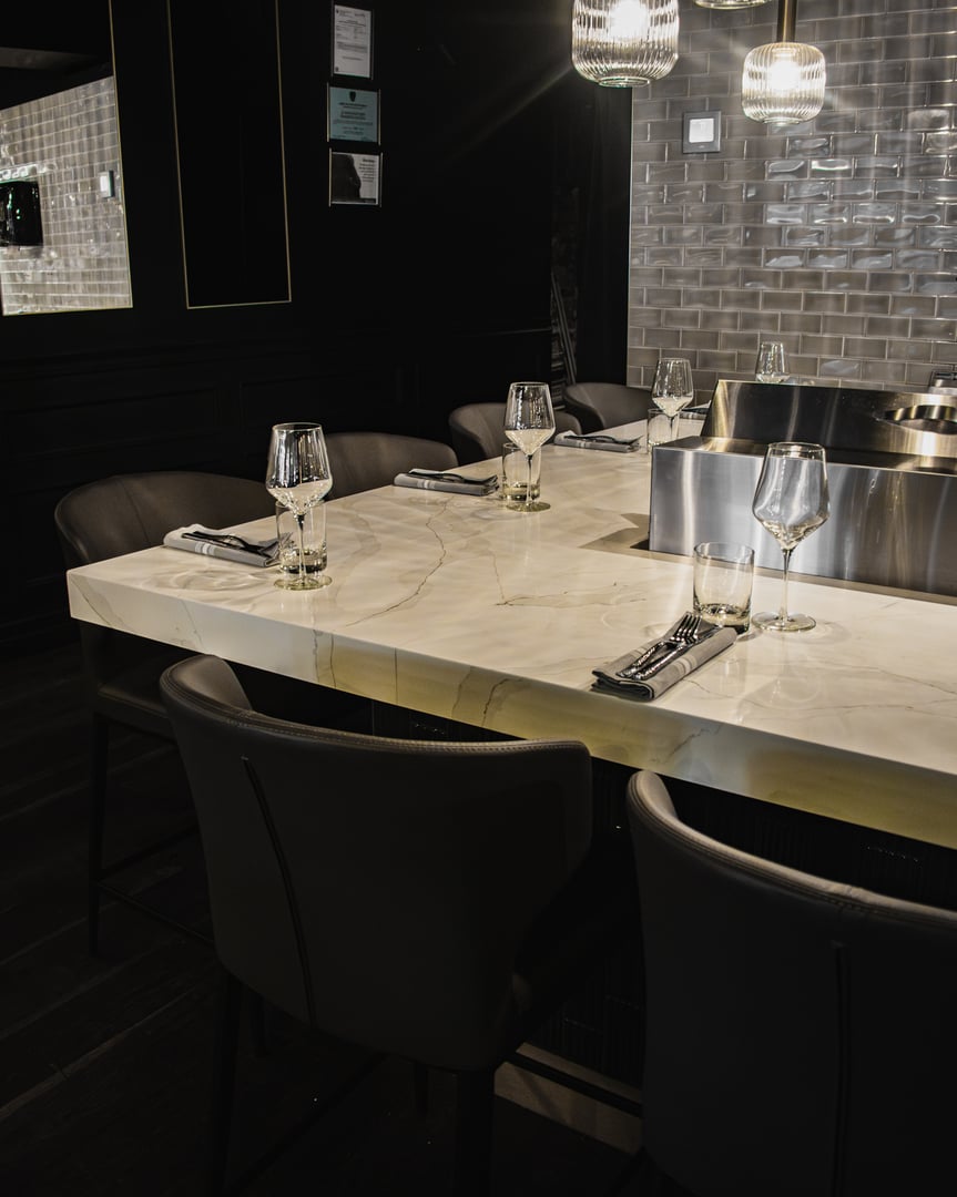 Seated directly at the chef’s table, guests are positioned ringside to the line—inside the rhythm of service, where focus, precision, and timing are on full display. This is the restaurant at its most immediate: unfiltered, disciplined, and deeply intentional.